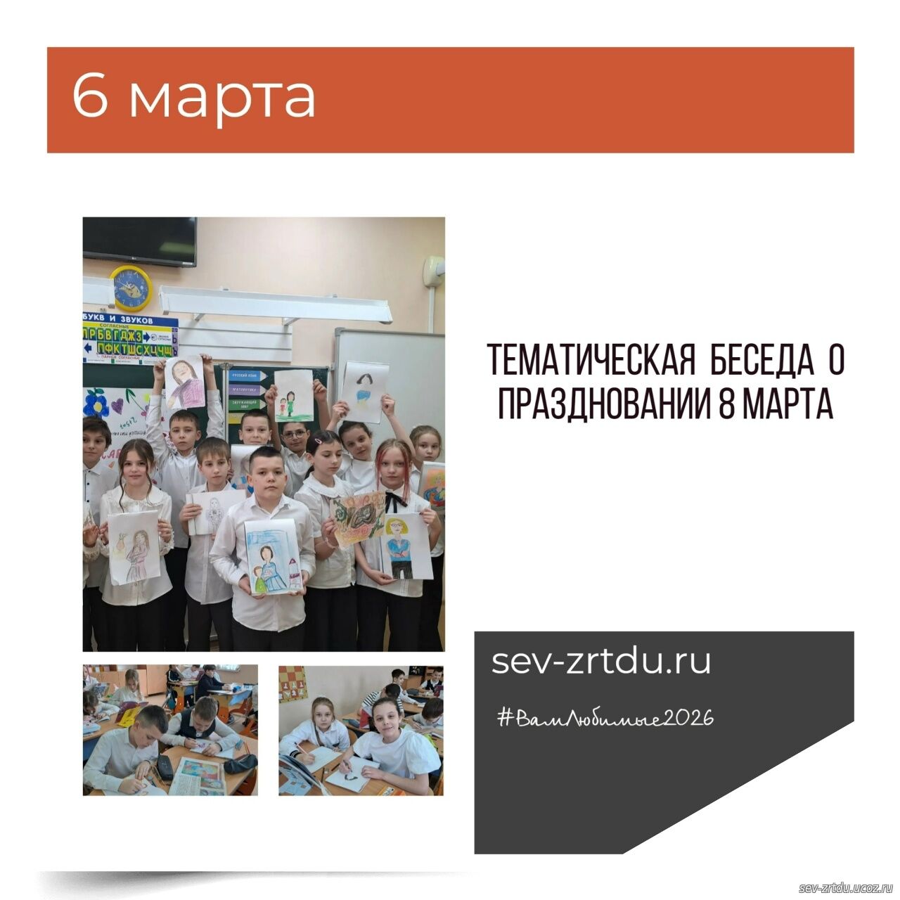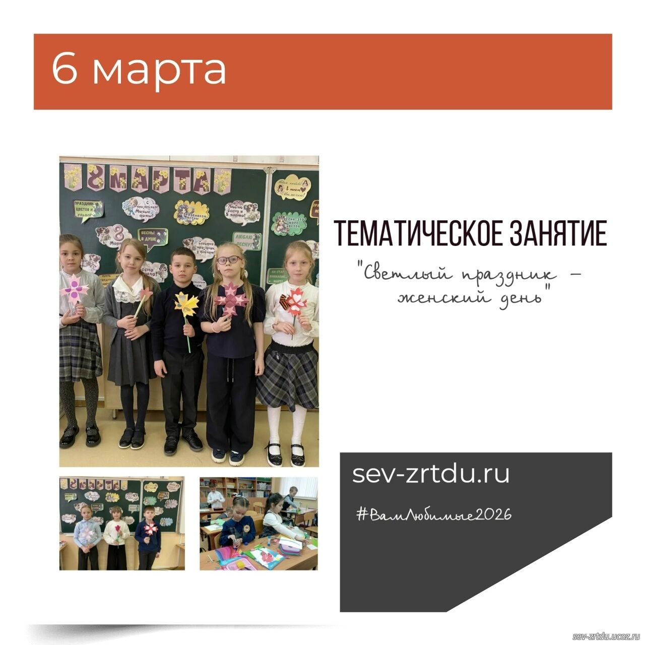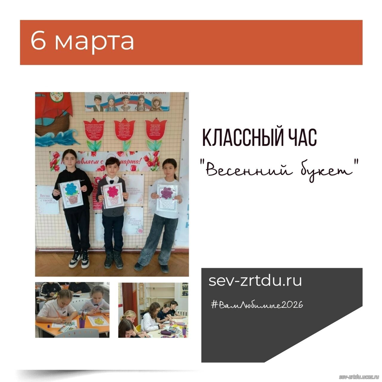 8 Марта -это день, когда поздравляют прекрасных женщин, отмечают их силу, красоту и вдохновение. В преддверии этого замечательного праздника в объединениях "Лингвист" и "Английский FM" (педагоги Николенко Л. И., Корчигина И. Е). прошёл классный час "Весенний букет". Учащиеся говорили об истории праздника, о том, как его отмечают в разных странах мира, отгадывали загадки, отвечали на вопросы шуточной викторины. Много тёплых слов сказали девочки и мальчики в адрес своих мам и приготовили для них подарок в виде цветка, где написали свои пожелания. Ребята получили массу положительных эмоций и хорошее настроение.