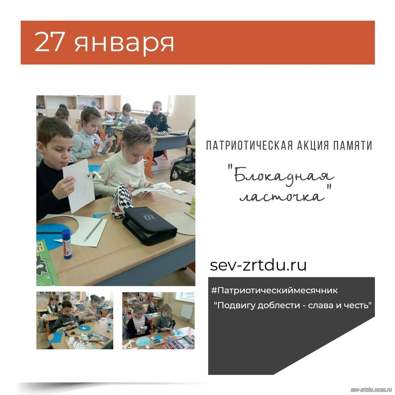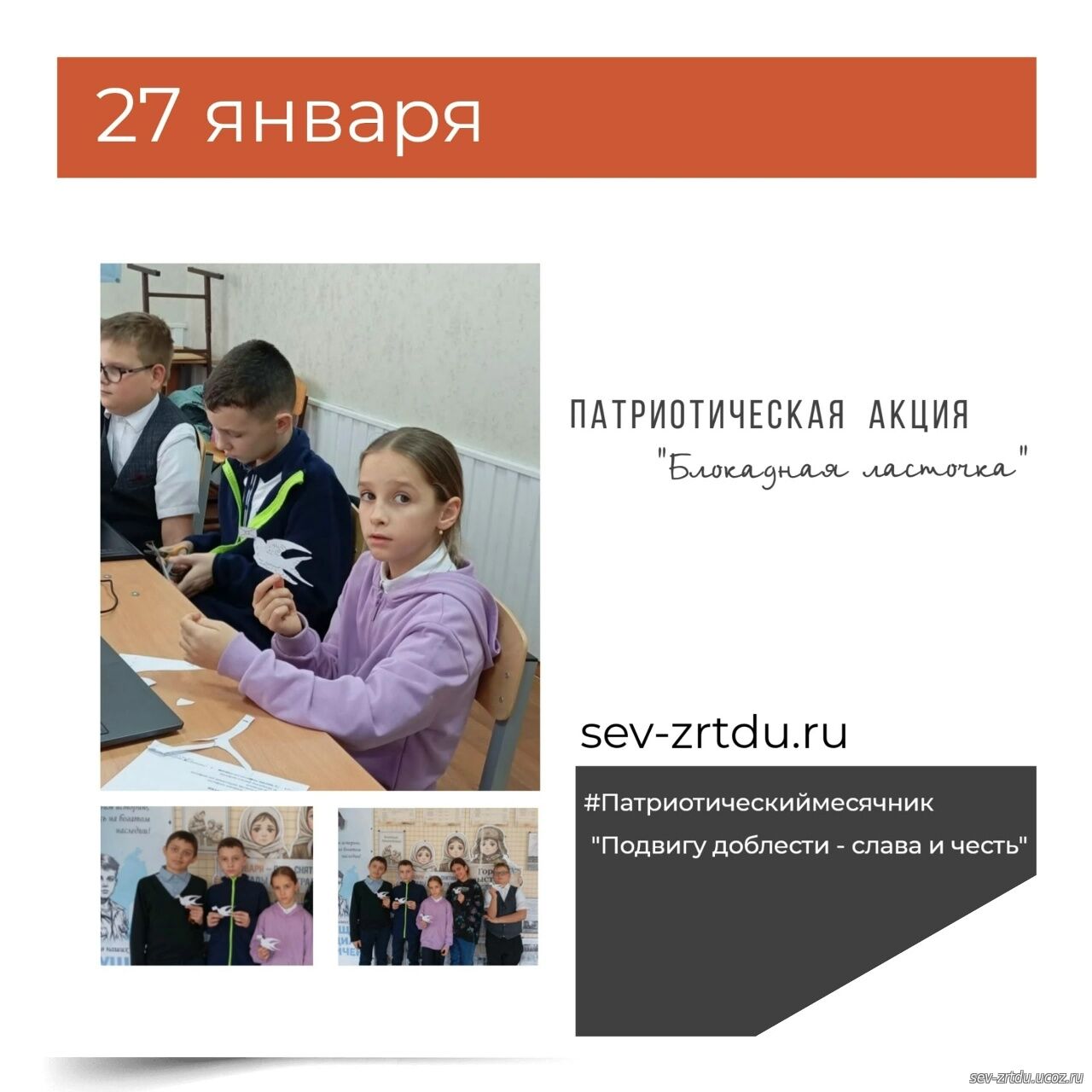 27 января, учащиеся объединения "Компьютерная грамотность" приняли участие в патриотической акции "Блокадная ласточка". Педагог Соломина М.Е. провела беседу о самой тяжёлой странице в истории Великой Отечественной войны, показала видео с рассказом свидетеля тех страшных событий, маленького жителя блокадного Ленинграда. Ребята узнали о возникновении символа надежды -ласточки блокады и вырезали ласточек из бумаги.