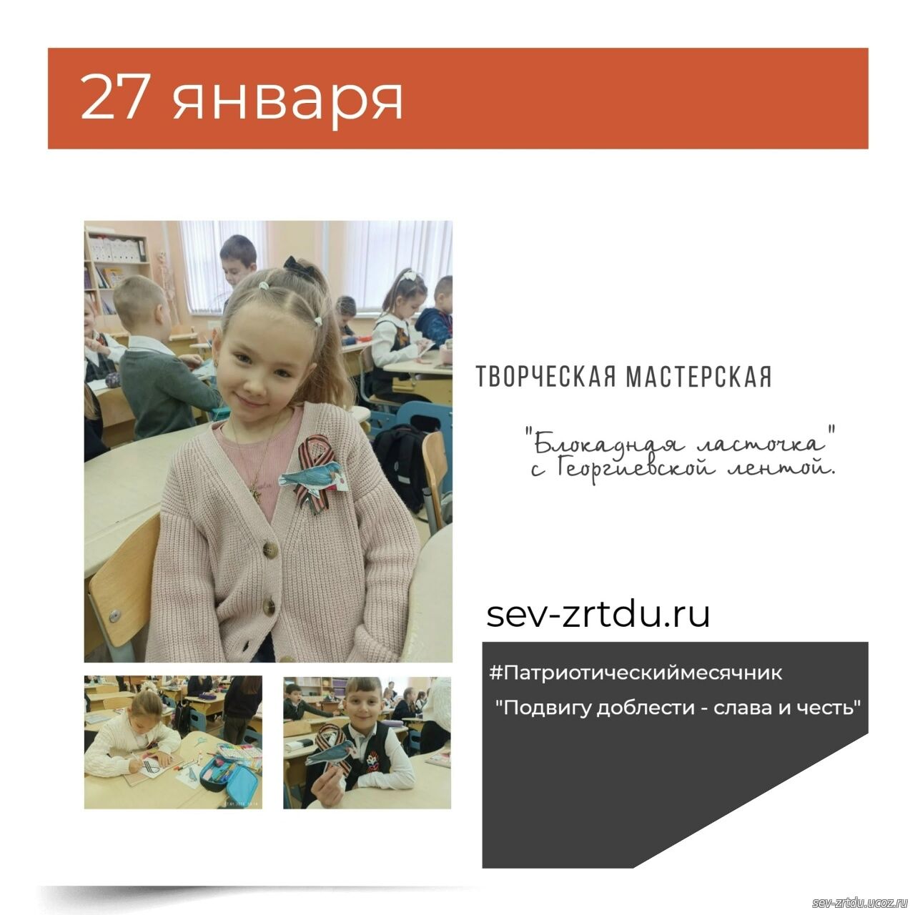 Сегодня, 27 января – День снятия блокады Ленинграда. В объединении «Город мастеров» (педагог Кочарян Г.В.) учащиеся познакомились с историей мальчика Алёши, который поделился своими воспоминаниями о жизни в осажденном городе. В память о мужестве и стойкости ленинградцев, ребята выполнили творческую работу – "Блокадную ласточку" с Георгиевской лентой. Ласточка – символ надежды и весны, а Георгиевская лента – символ героизма и победы.