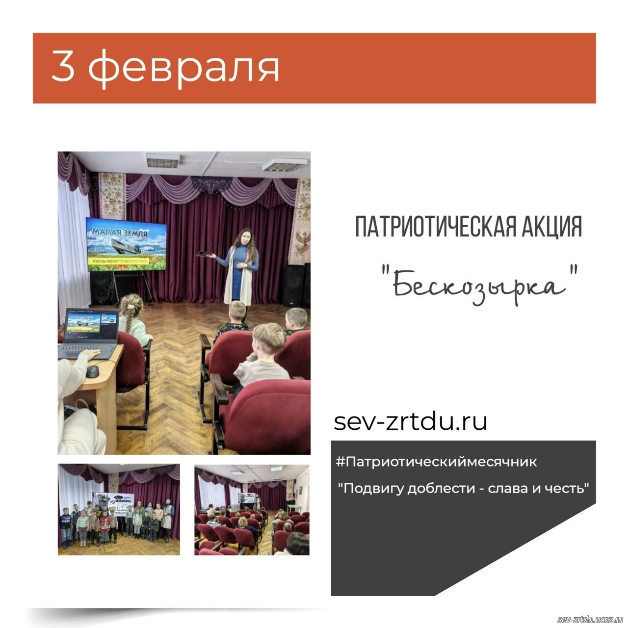 В рамках ежегодной патриотической акции «Бескозырка», в Центре Творчества проходит кинолекторий для учащихся объединений. «Бескозырка» — дань памяти легендарному десанту майора Цезаря Куникова на плацдарм, который вскоре станет известен всему миру как «Малая Земля». Ребята узнали о героических страницах освобождения Новороссийска, боях на Малой земле. 83 года назад, в Новороссийске, в штормовую ночь с 3 на 4 февраля 1943 года, совершили свой беспримерный подвиг моряки-десантники, легендарные защитники огненного плацдарма. 225 дней в ожесточенных боях черноморцы удерживали плацдарм, названный ими «Малой землей». Более двадцати тысяч судеб оборвалось здесь, на черноморском берегу, освобождая г