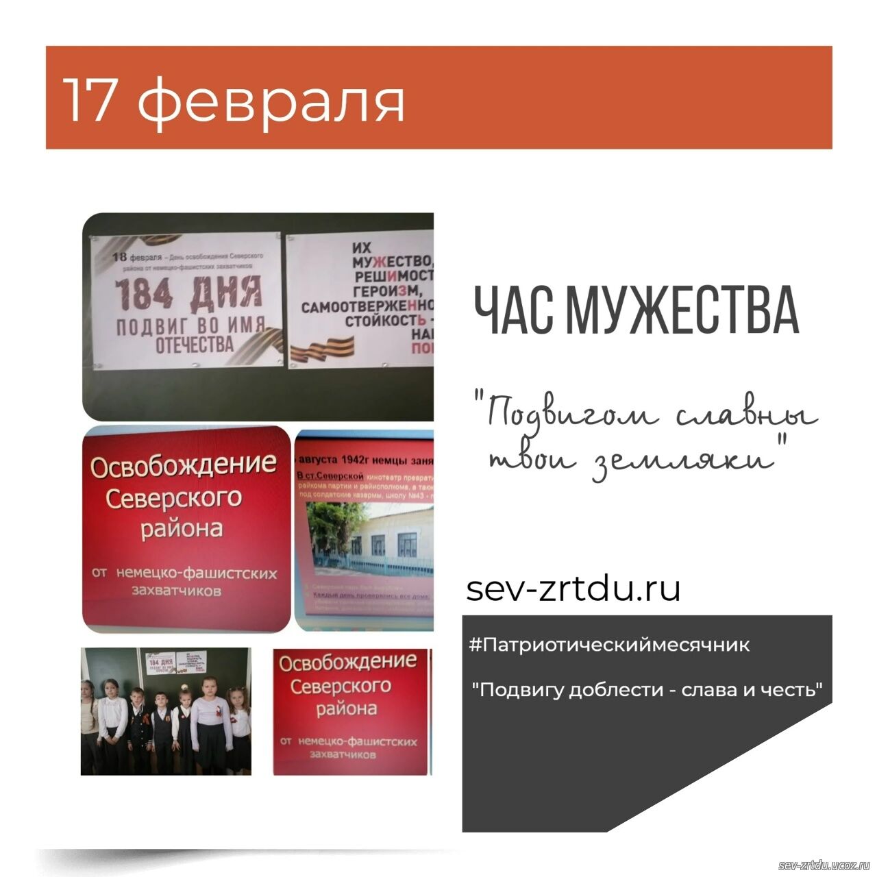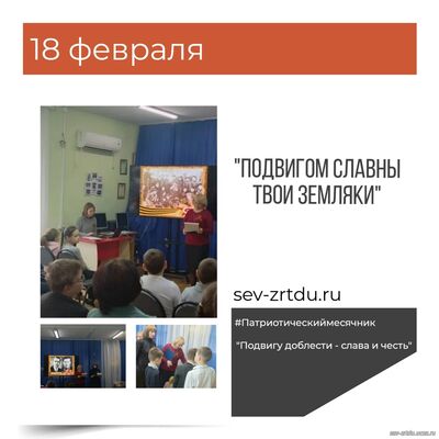 18 февраля значимая дата для всего Северского района - 83 года назад станица Северская была освобождена от фашистской оккупации. В объединении "Казачий круг " (педагог Мацагора Е М ) прошёл Час мужества "Подвигом славны твои земляки". Учащиеся узнали о наступательной операции "Горы", благодаря которой был освобожден Северский район, о страшных страницах оккупации , о борьбе с фашистами партизанских отрядов. В этот день мы вспоминаем всех, кто отдал свои жизни за освобождение станицы Северской и всей нашей родной земли.