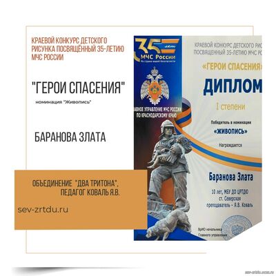Поздравляем Баранову Злату, учащуюся объединения «Два Тритона» (педагог Коваль Яна Вячеславовна) с победой, дипломом 1 степени, в краевом конкурсе детского рисунка, посвященном 35-летию МЧС России. Желаем новых побед и творческого развития.